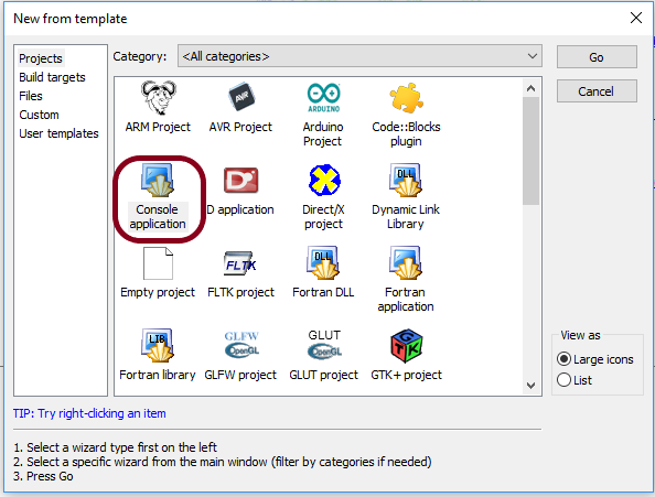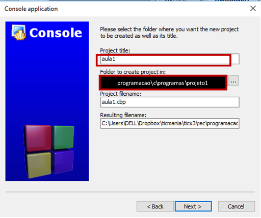Criar projeto | Menu file > New >project > console application > C (nome do projeto + local onde vai ser guardado) |