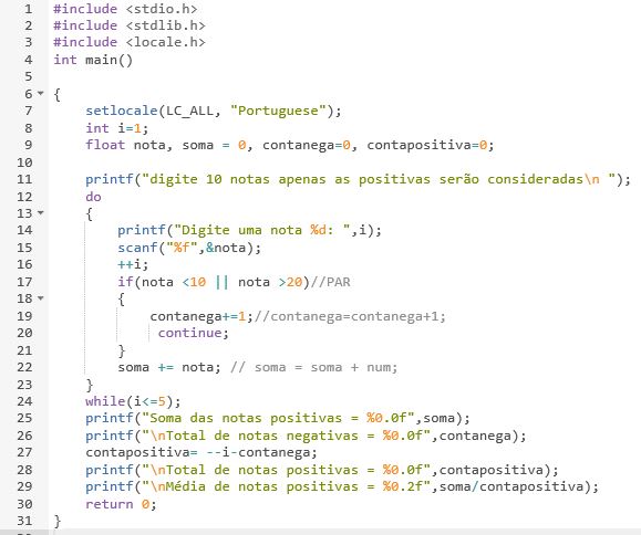 printf("\nMédia de notas positivas = %0.2f",soma/contapositiva);
