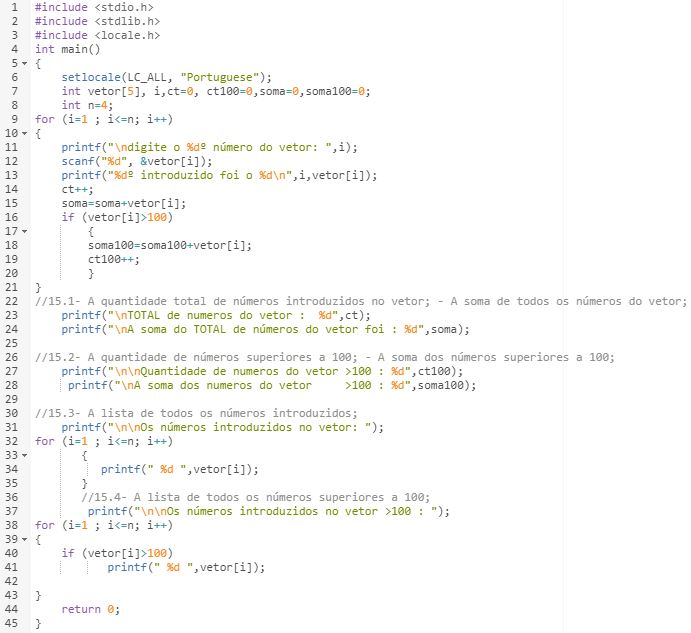 15.1- A quantidade total de números introduzidos no vetor; - A soma