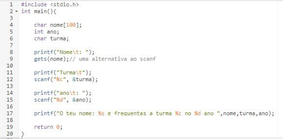 printf("O teu nome: %s e frequentas a turma %c no %d ano ",nome,turma,ano);