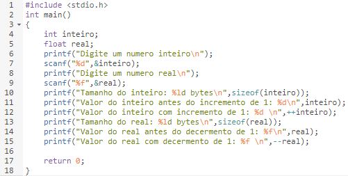 1 no número inteiro, mostrando o valor da variável antes e após o incremento ou decremento. O programa deve, também, indicar o espaço que ocupam as variáveis utilizadas no programa. Utilize os operadores de incremento e decremento e SizeOf.