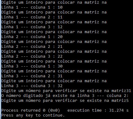 Depois da matriz preenchida o programa deve solicitar ao utilizador um número inteiro e escrever uma mensagem indicando se o valor digitado existe ou não na matriz.